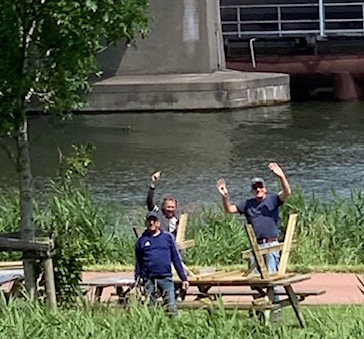 Ben, Rudsel en Paul S. van onze Technische Buren Hulp ('de TBH') doen onderhoud aan de picknicktafels en zetten hier een nieuw exemplaar in elkaar in het gras langs de dijk. Schoonmaken, schuren, verstevigen en in de olie zetten. Het ziet er mooi uit, ze worden vaak gebruikt en ze gaan weer een tijd mee.